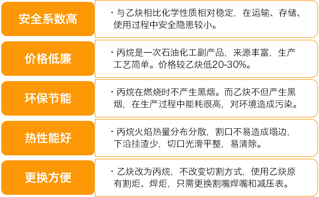 在切割焊接等工藝中,丙烷和乙炔都是常用的可燃?xì)怏w。然而在具體實(shí)踐中,丙烷因其安全、綠色、高效、性價比高等特點(diǎn),逐漸成為工業(yè)用戶的首選氣體,大有取代乙炔之勢。與乙炔等氣體相比,丙烷具有多種優(yōu)勢: